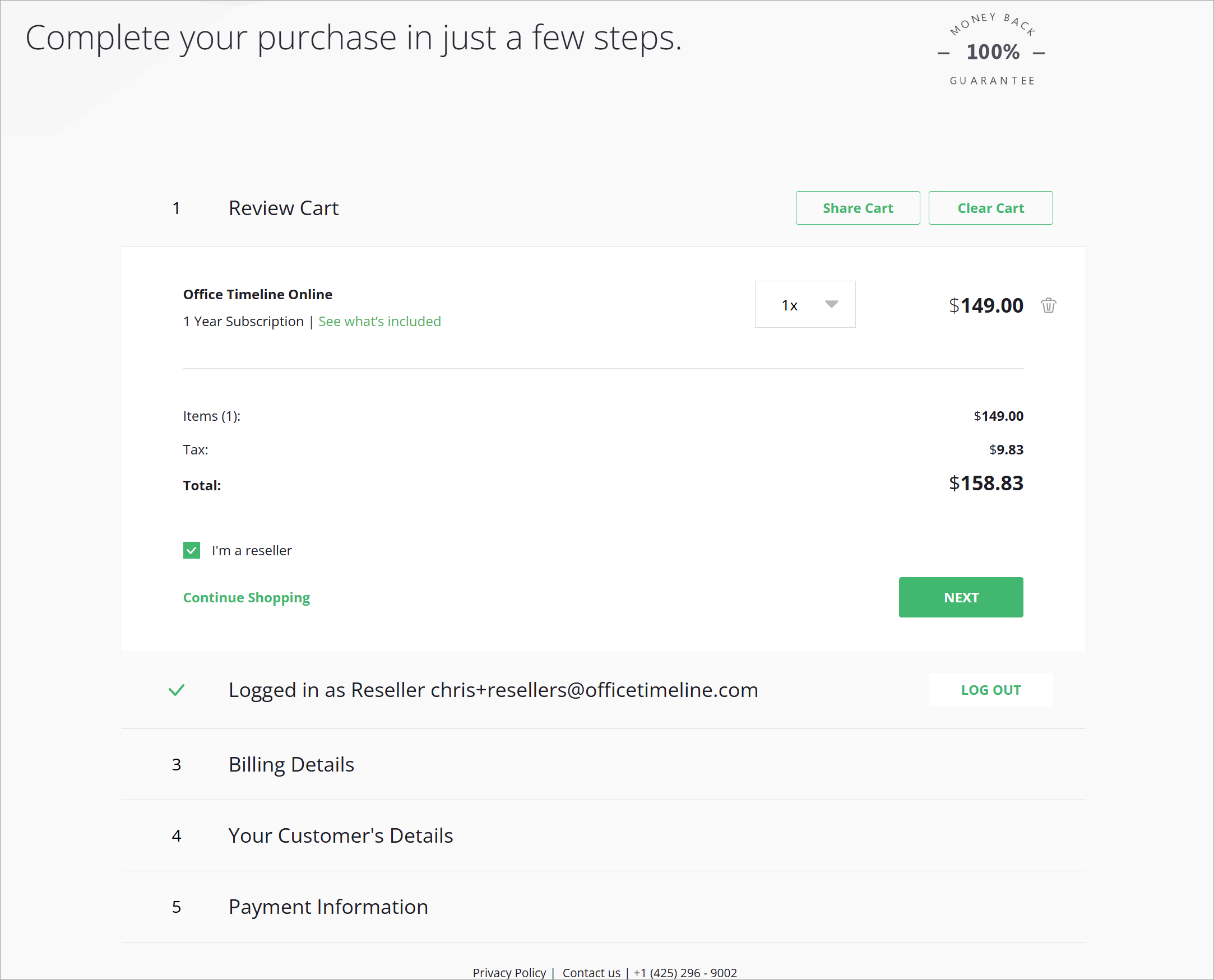 After logging in, you will be brought to the cart. Review the order details. If this is your first time ordering as a reseller, check the 'I'm a reseller' box before continuing.