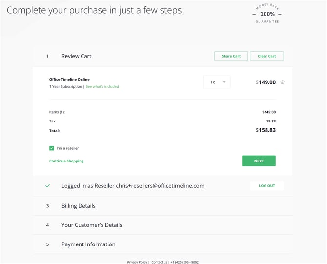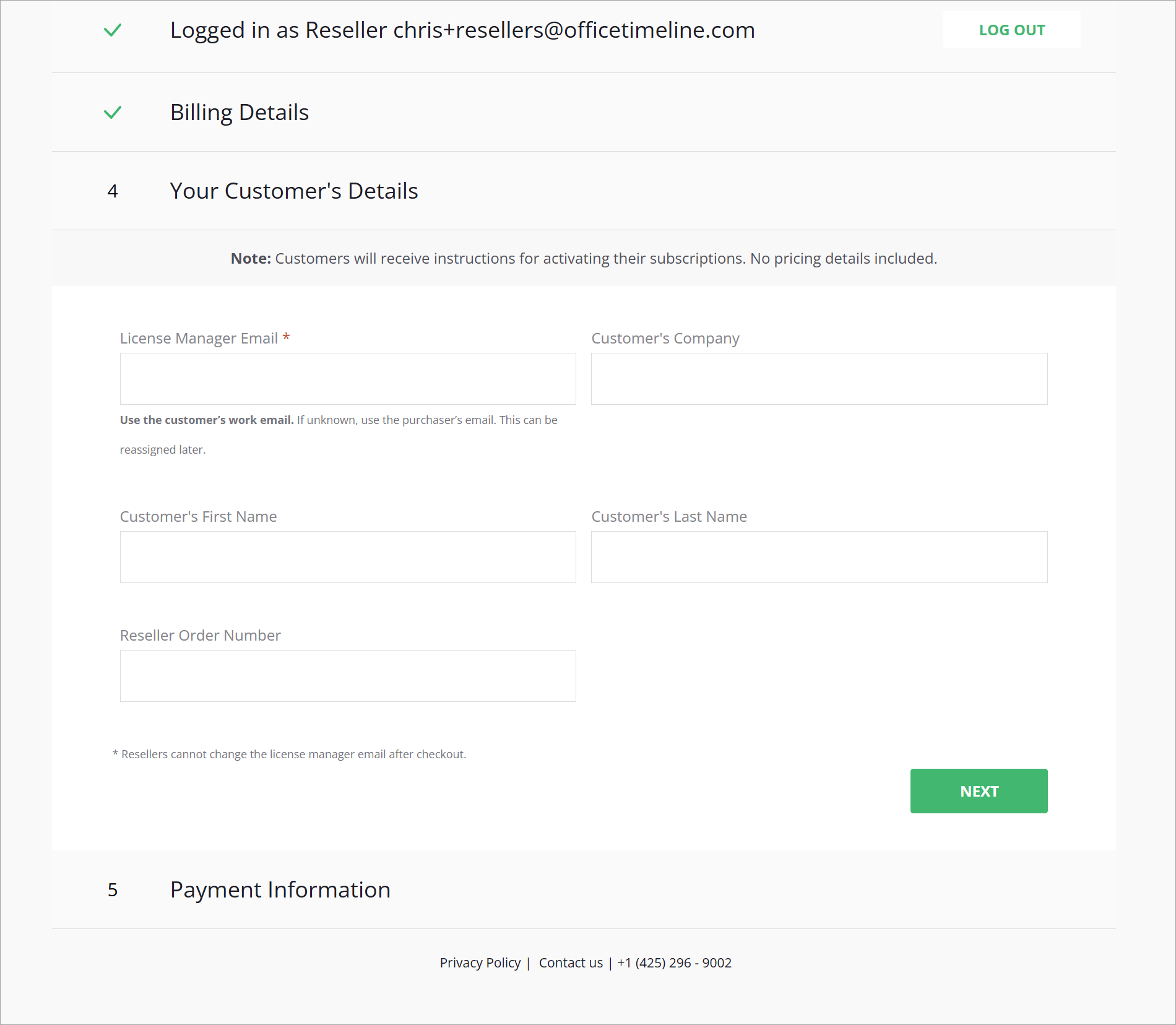The email address in the customer details step is critical. It must match the License Manager's email for this subscription. If you need to make a correction, contact us at support@officetimeline.com.
