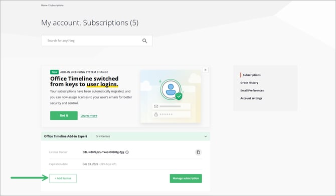 Select 'Subscriptions' from your profile menu. Use the search field to locate your client's subscription by Order Number, Subscription ID, or email address, then click the 'Add Licenses' button.